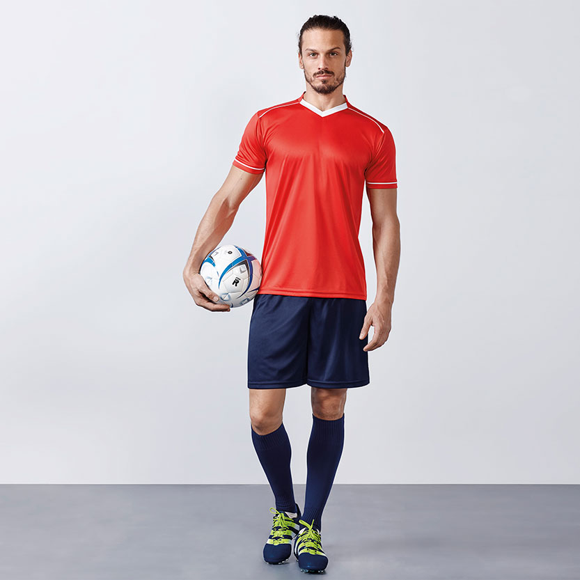 Características.Conjunto deportivo unisex compuesto de 2 camisetas + 1 pantalón. 1.- Manga corta con vivo ancho en contraste.2.- El color de la segunda camiseta seccompone de manera contraria.3.- Cuello redondo con ribete bicolor y con cubrecosturas reforzado en su interior. 4.- Pantalón con cinturilla elástica con cordón interior al tono con pespunte de seguridad. Tejido. Composición100% poliéster, 140 g/m². *Conjunto sin calcetas.*Especial sublimación. *Pack varias piezas.*Disponible en tallas infantiles.