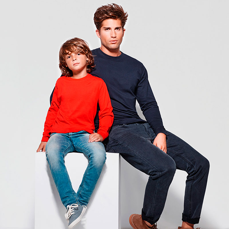 Características.Camiseta de manga larga y cuello redondo 4 capas. Cubrecosturas de refuerzo en cuello y hombro. Sin puños. Costuras laterales.Tejido.100% algodón, punto liso, 160 g/m².*Tambén modelo mujer