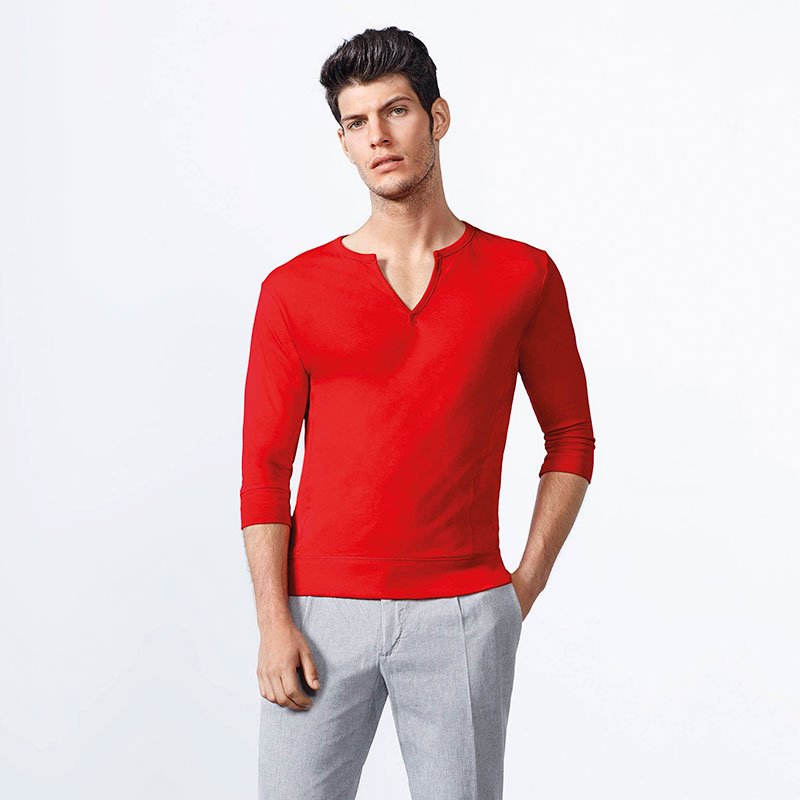 Características.Camiseta de hombre con manga al codo y escote en V ribeteado. Paneles laterales con costuras remalladas. Bajos y puños anchos en punto liso.Tejido.100% algodón, 150 g/m².